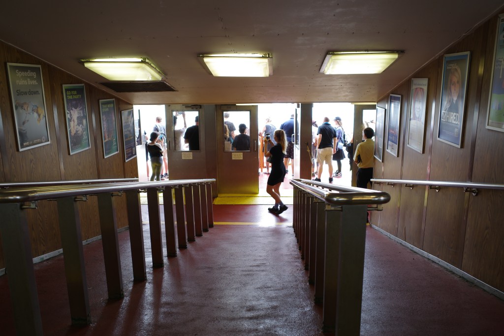 Trotz der relativ vielen Passagiere geht das einsteigen recht flott und es verteilt sich auf der Fähre auch recht gut – alle Touris auf einer Seite, der Rest auf der anderen.
